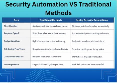 When teams deploy security automations, systems act immediately. Alerts get sorted, enriched, and put on priority before humans engage with them. Speed is not the only element of differentiation between deploying security automations and traditional methods. It is more about bringing clarity under pressure.