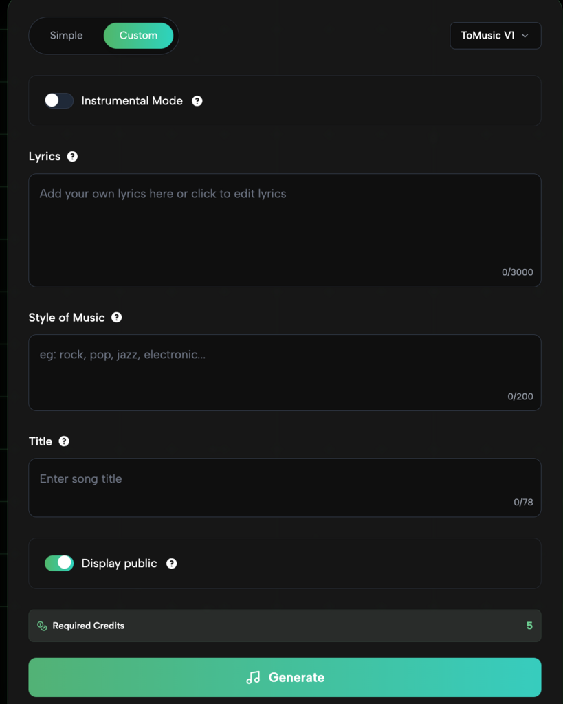 - Custom Mode: Best for songwriters. Select this to input specific lyrics, define a precise music style, and name your track.