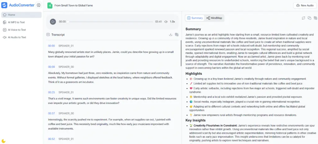 (Audio Converter AI converts audio to text with timestamps and summary)