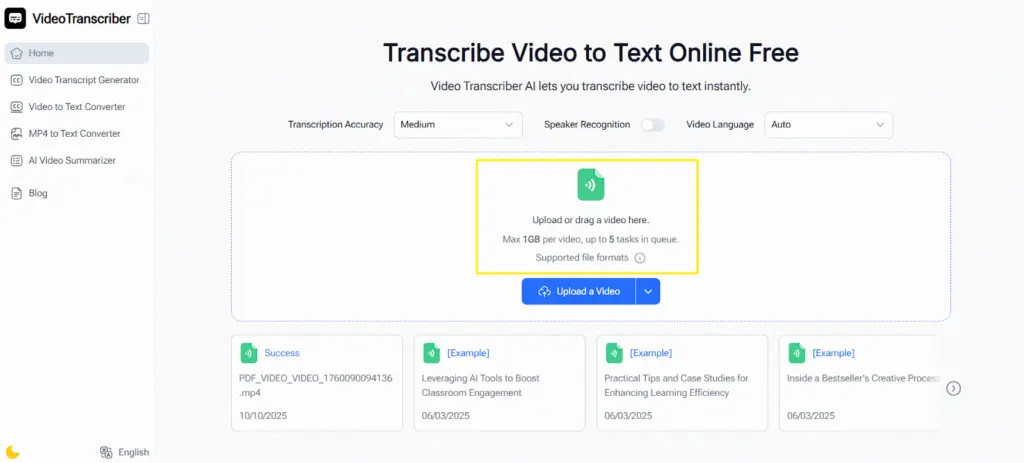 - Transcribe Videos: Upload all files to Video Transcriber AI for instant conversion.