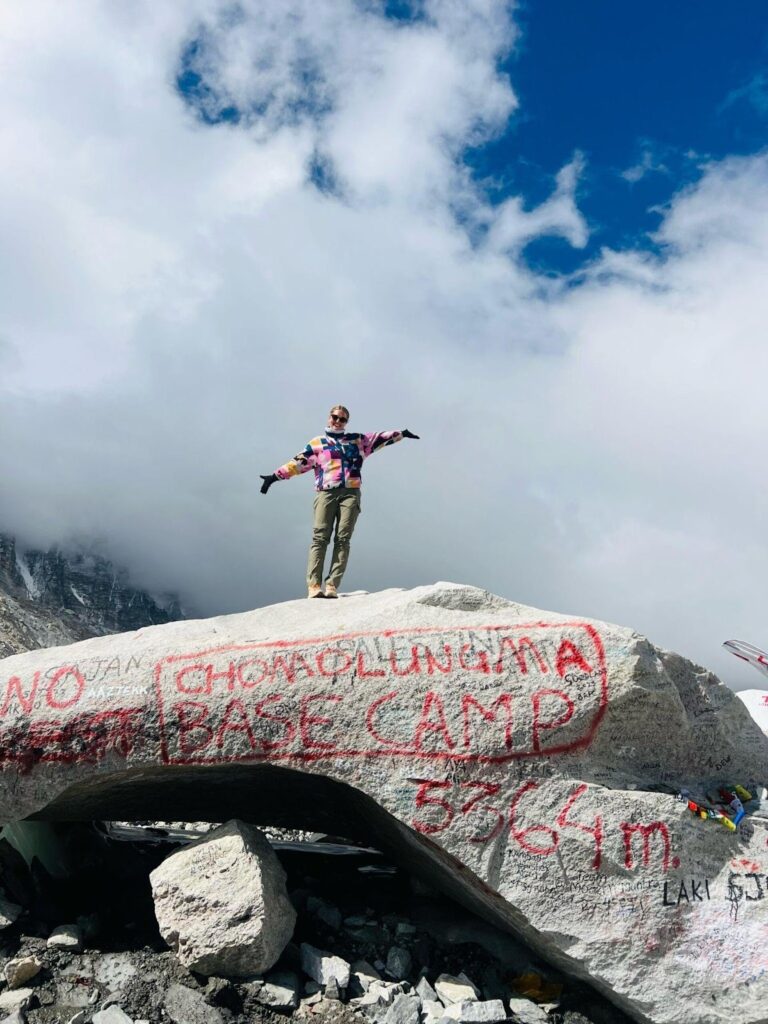 After hours of steady effort, the prayer-flag coverd cairns of Base Camp comes into view. There’s no single grande moment — no Everest summit, no sweepng view of the peak itself — but the emotion hit hard. This is where expeditons begins, where climbers steel themself for their date with destiny.